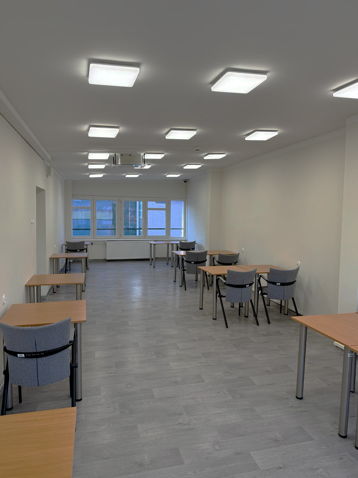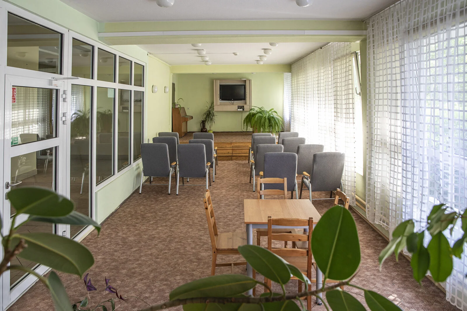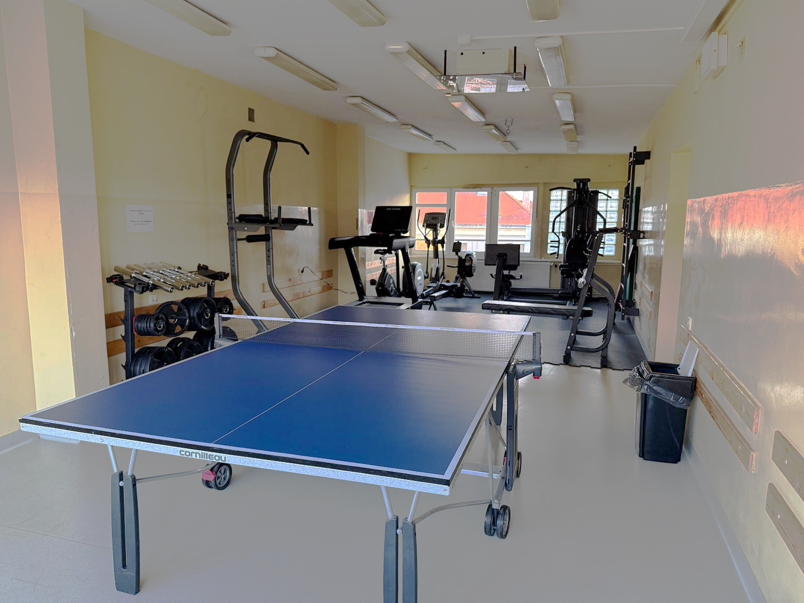There is a TV room on the ground floor of the building, a study room on the fifth floor and a sports hall.