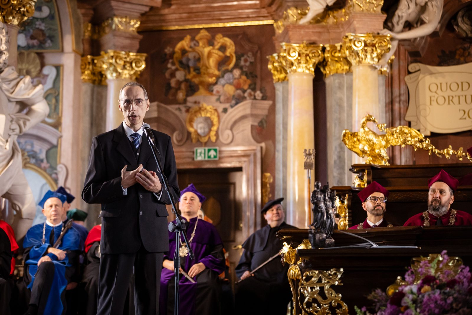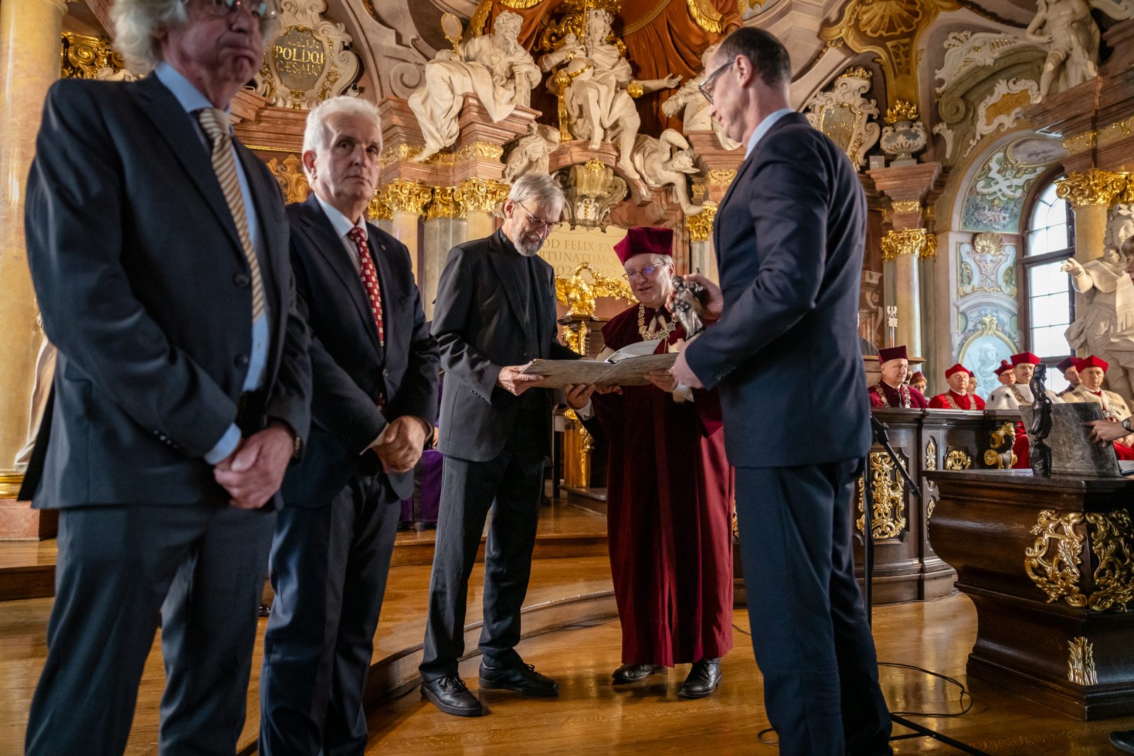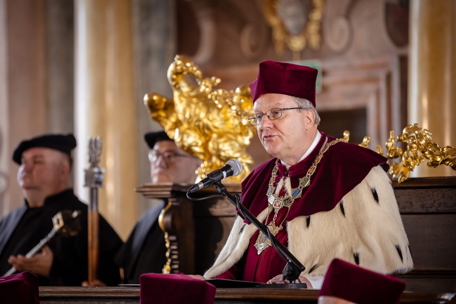 The Rector recalled the history of the University and highlighted the celebration of its eightieth anniversary. He began by citing the words of Władysław II Jagiellon and recalling unsuccessful attempts to establish a university in 1505. He noted that it was only through the efforts of the Jesuits that the Austrian Emperor Leopold I issued the founding document in Vienna, known as the Golden Bull, which established the two-faculty Leopoldine University in 1702. The University officially commenced operations on 15 November.