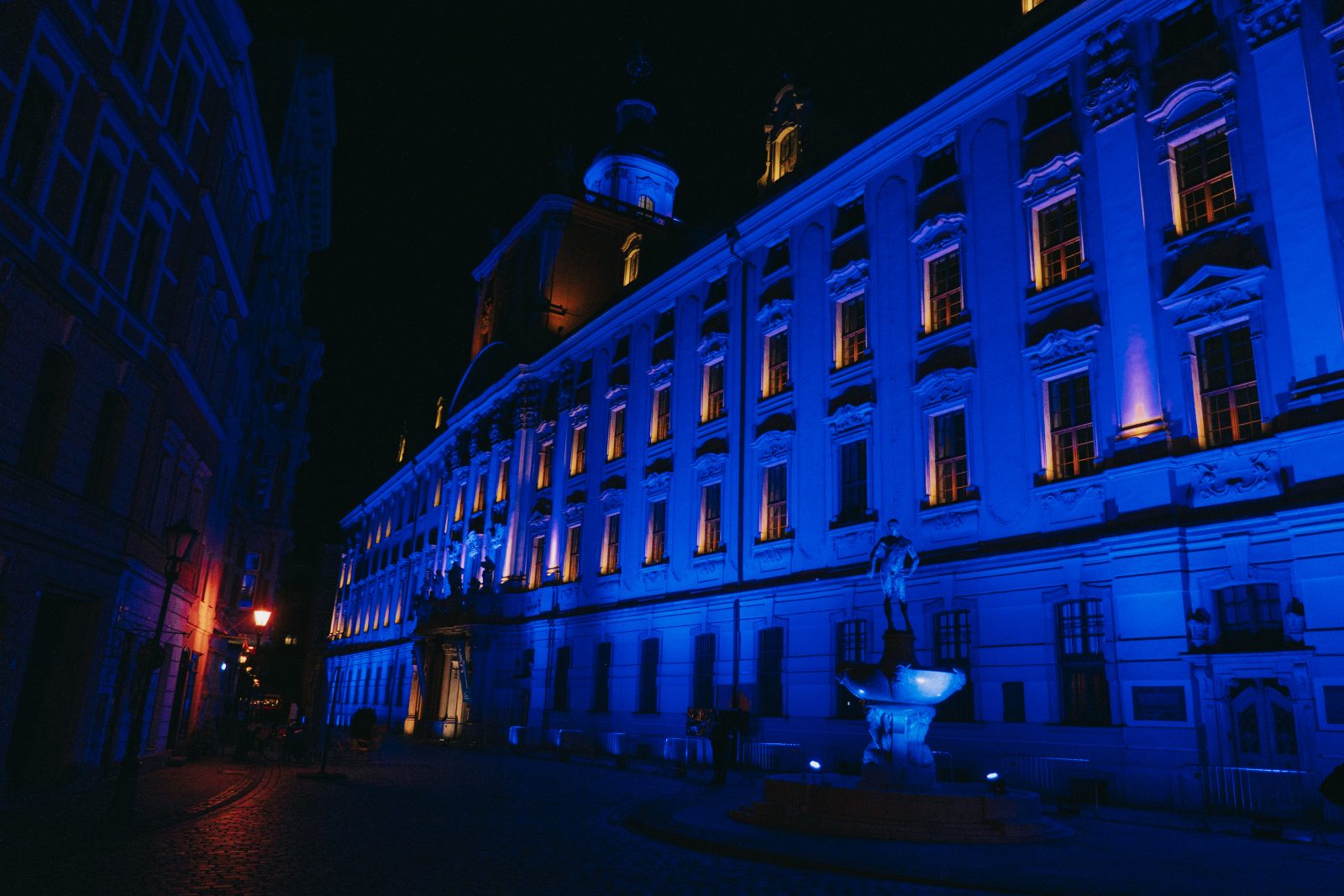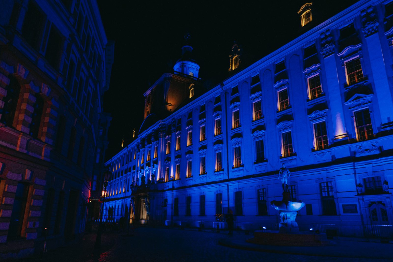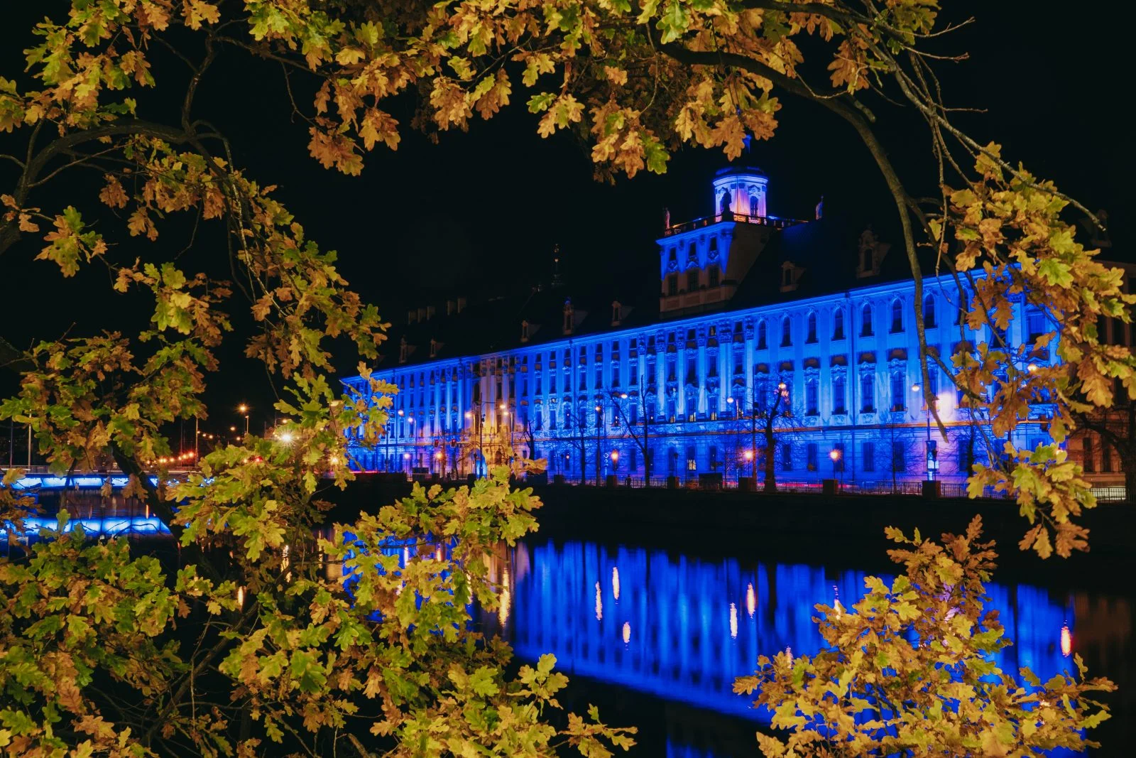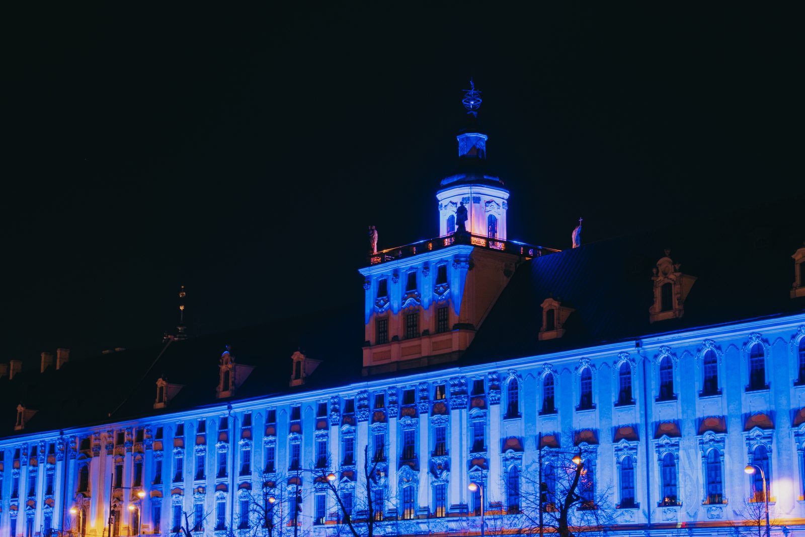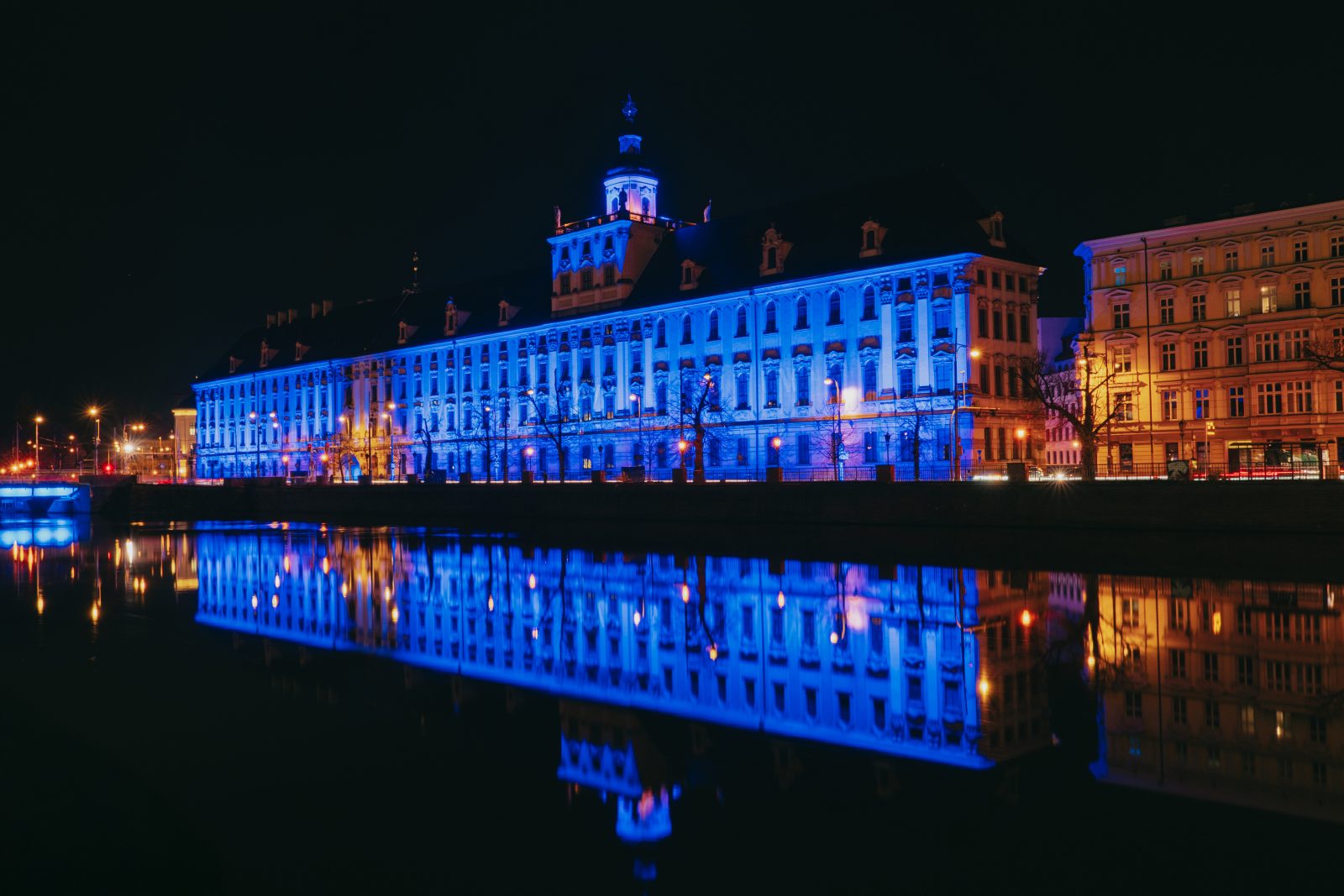 Jedną z wielu atrakcji, jakie Uniwersytet Wrocławski przygotował z okazji 80-lecia polskiej nauki we Wrocławiu, była iluminacja gmachu głównego uczelni i rozświetlenie go na niebiesko – czyli na oficjalny kolor UWr, zwany błękitem uniwersyteckim.
