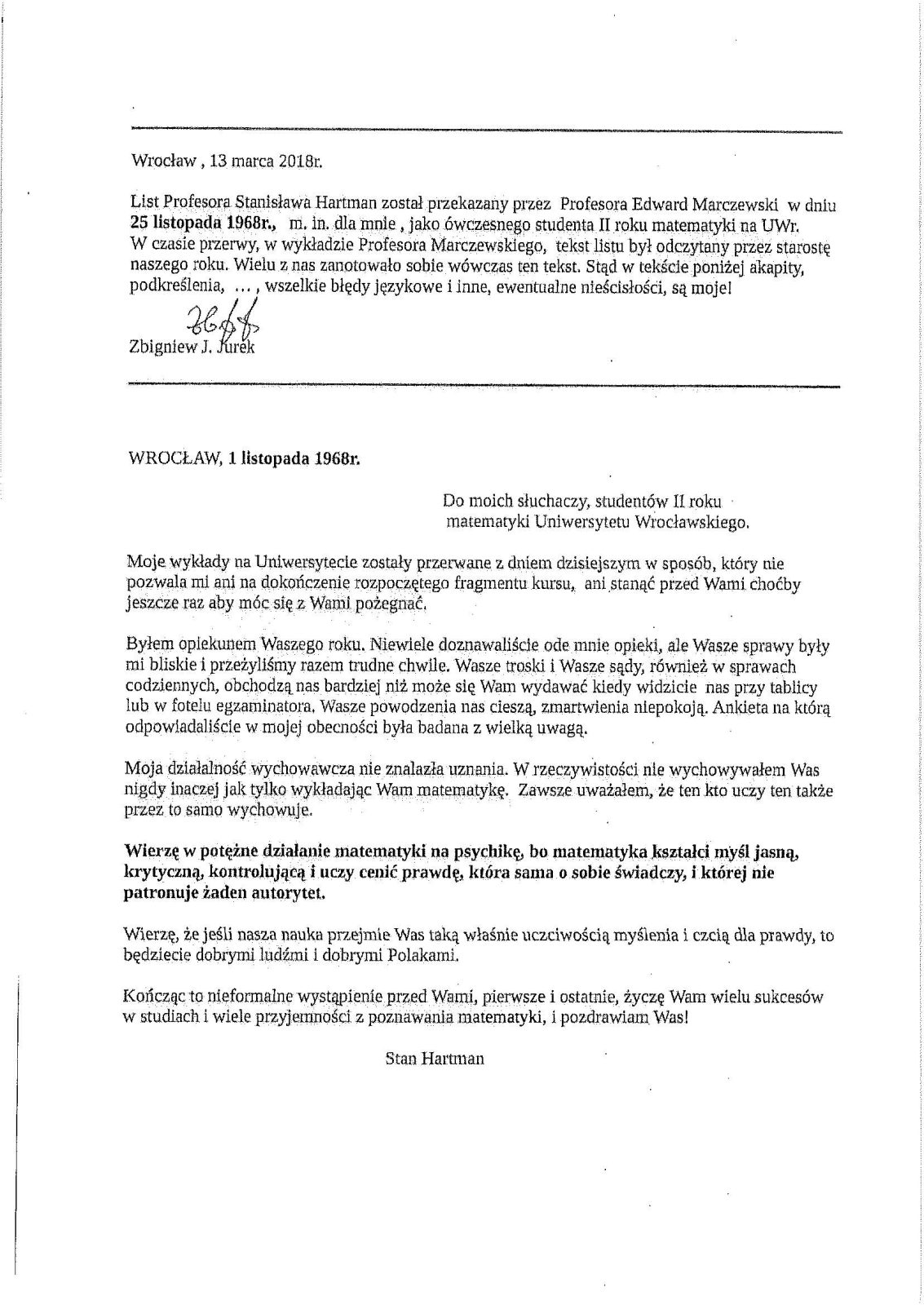 Na prośbę prof. Marczewskiego list studentom odczytał starosta roku, a jednym ze słuchaczy był Zbigniew Jurek, który skrzętnie zanotował, słowo w słowo.