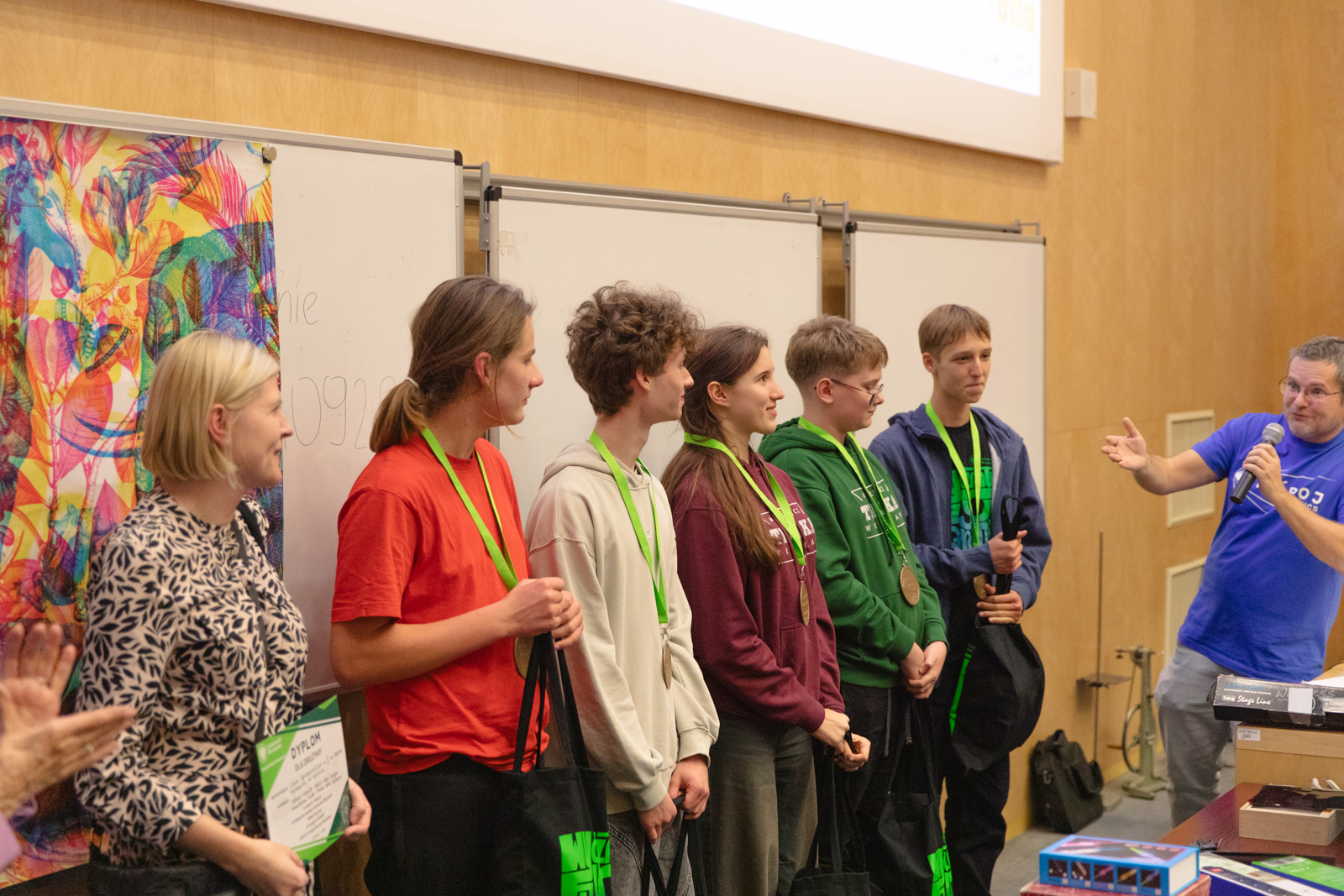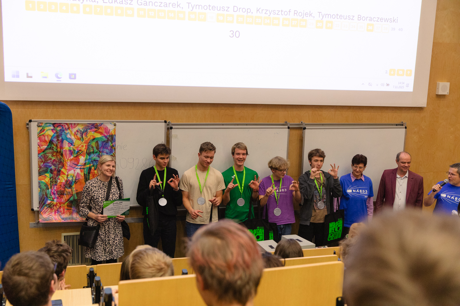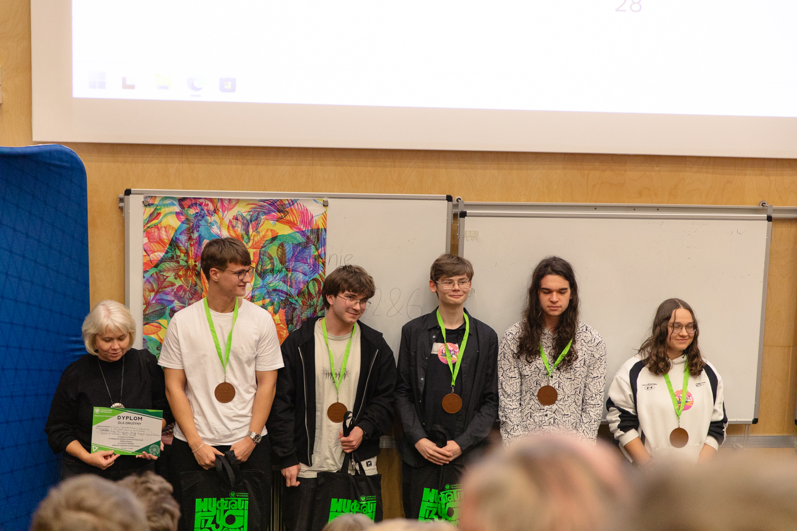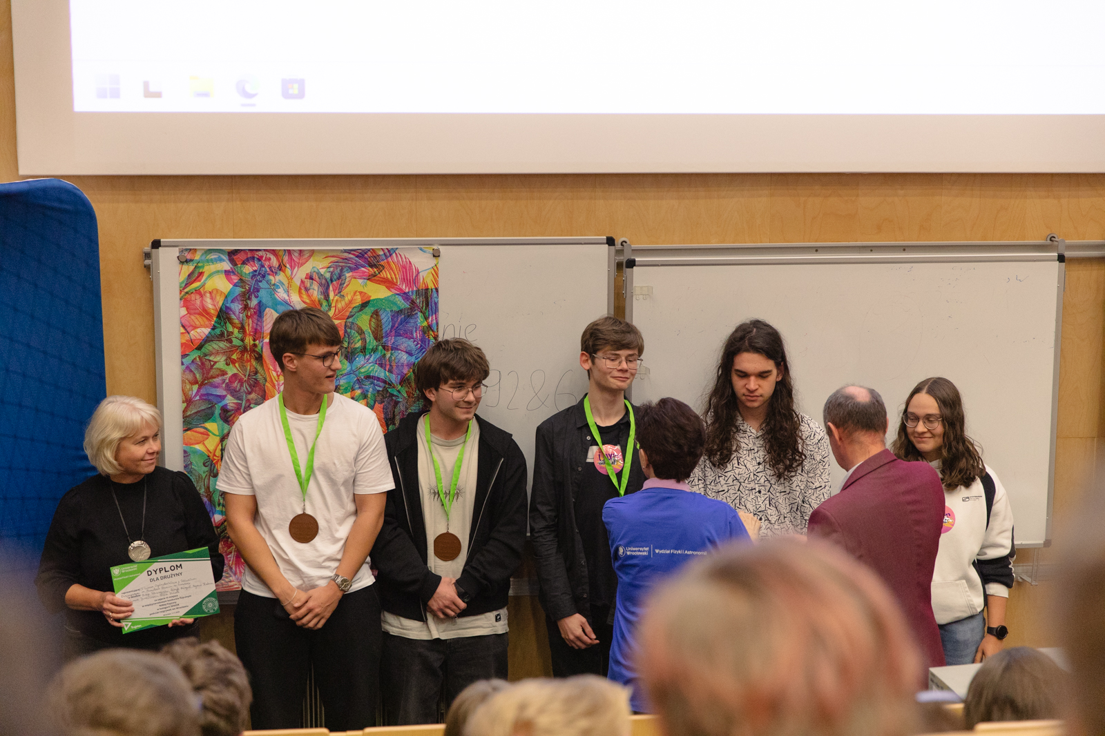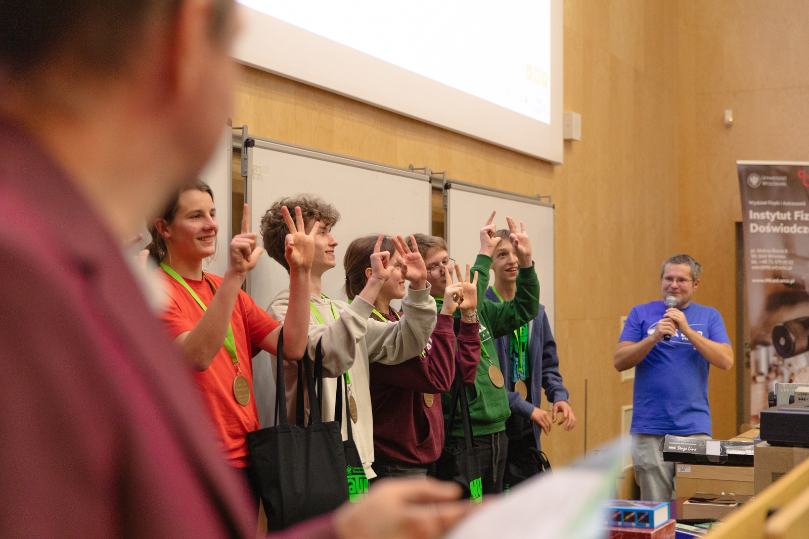 grupa pięciu chłopców z medalami na szyjach pokazuje gesty palcami do kamery, obok stoi mężczyzna z mikrofonem, całość dzieje się na sali wykładowej