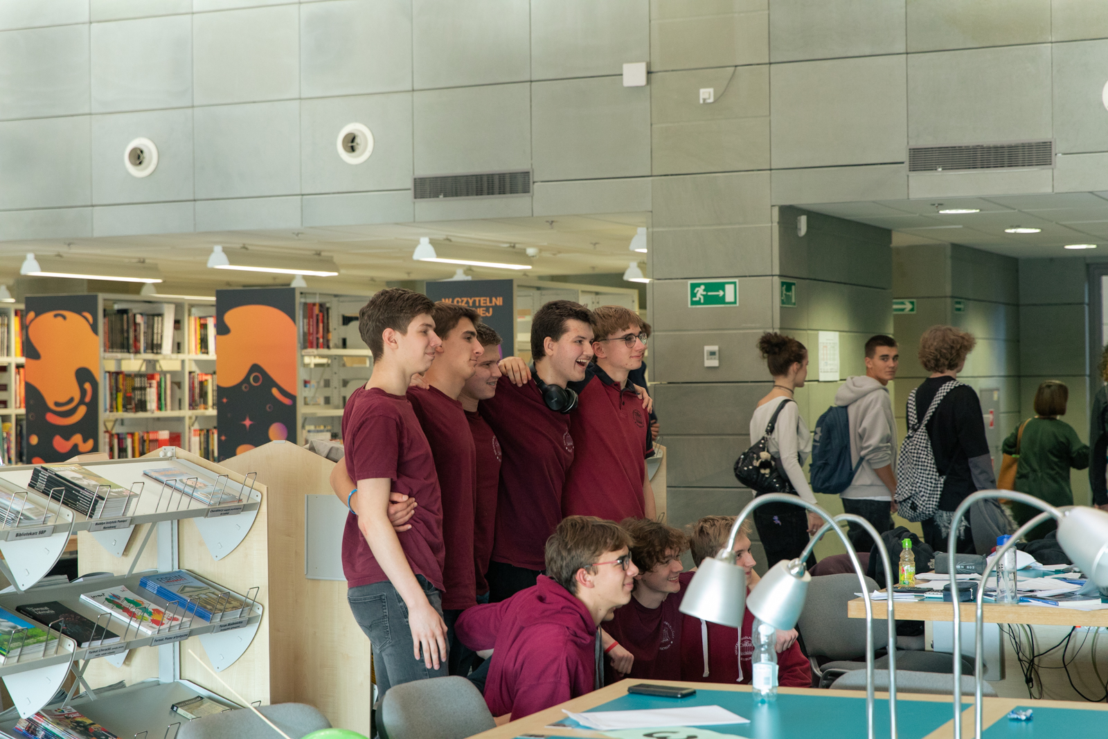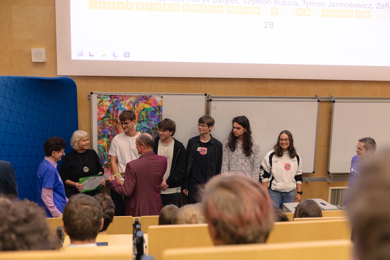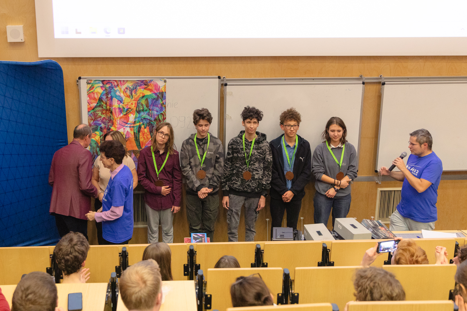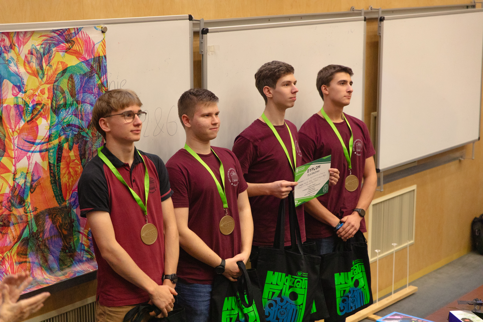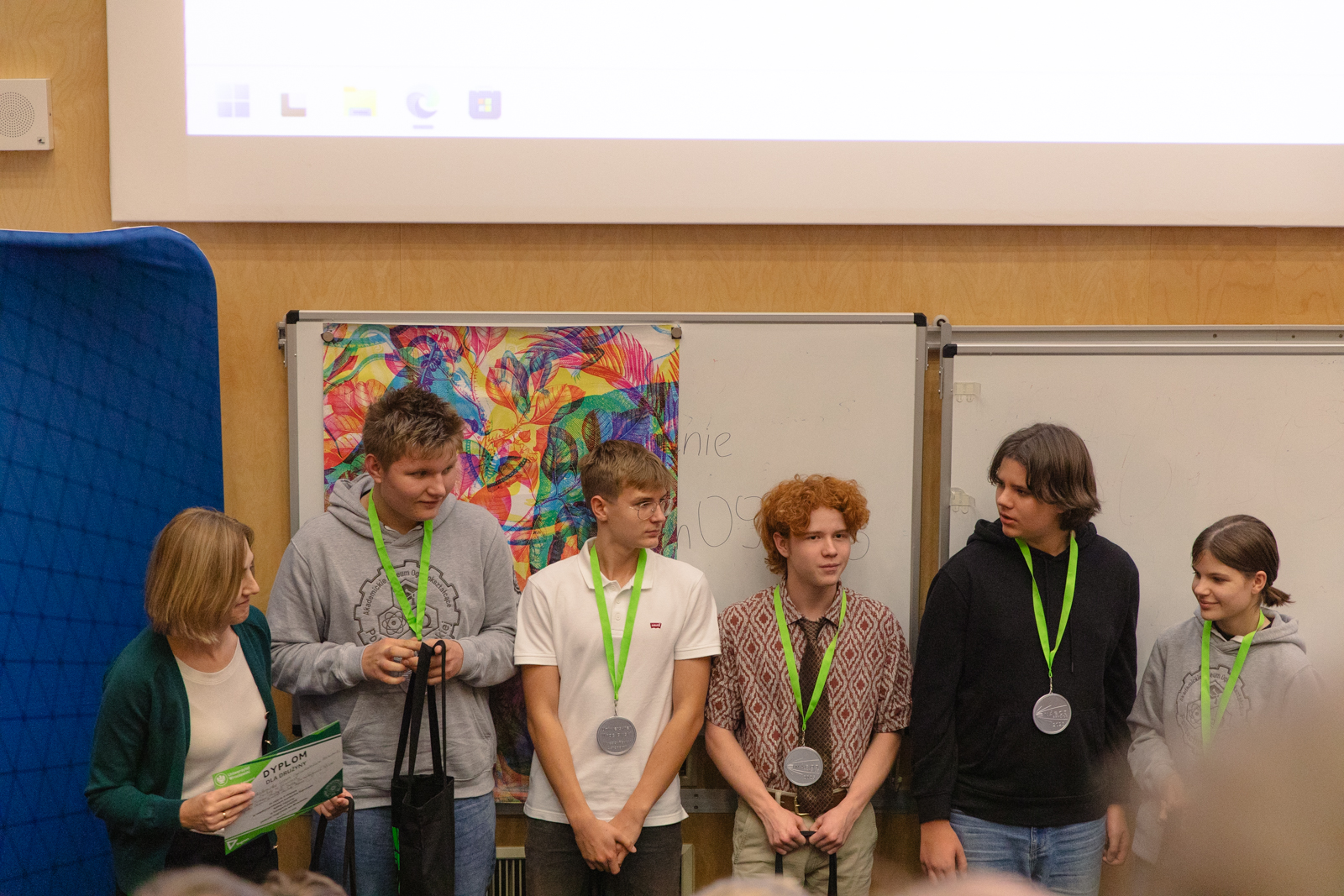 grupa pięciu chłopców z medalami na szyjach pokazuje gesty palcami do kamery, obok stoi mężczyzna z mikrofonem, całość dzieje się na sali wykładowej