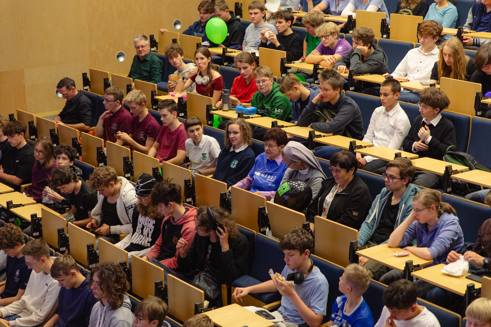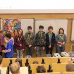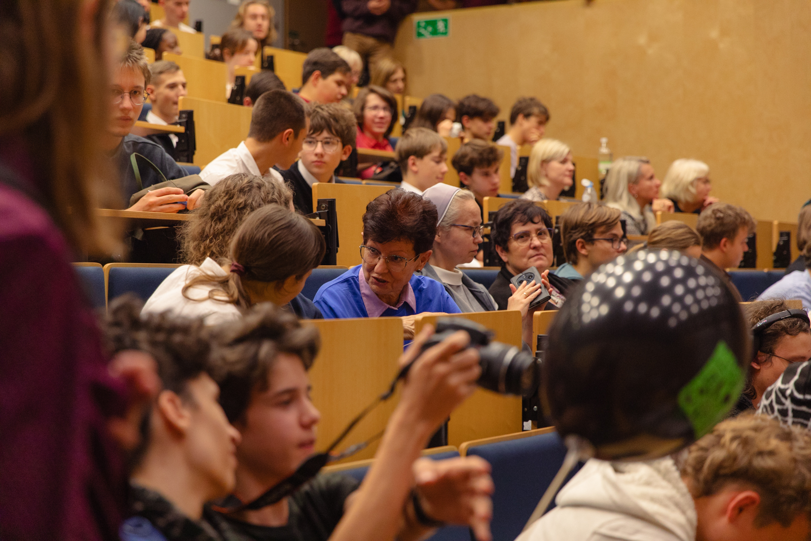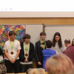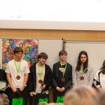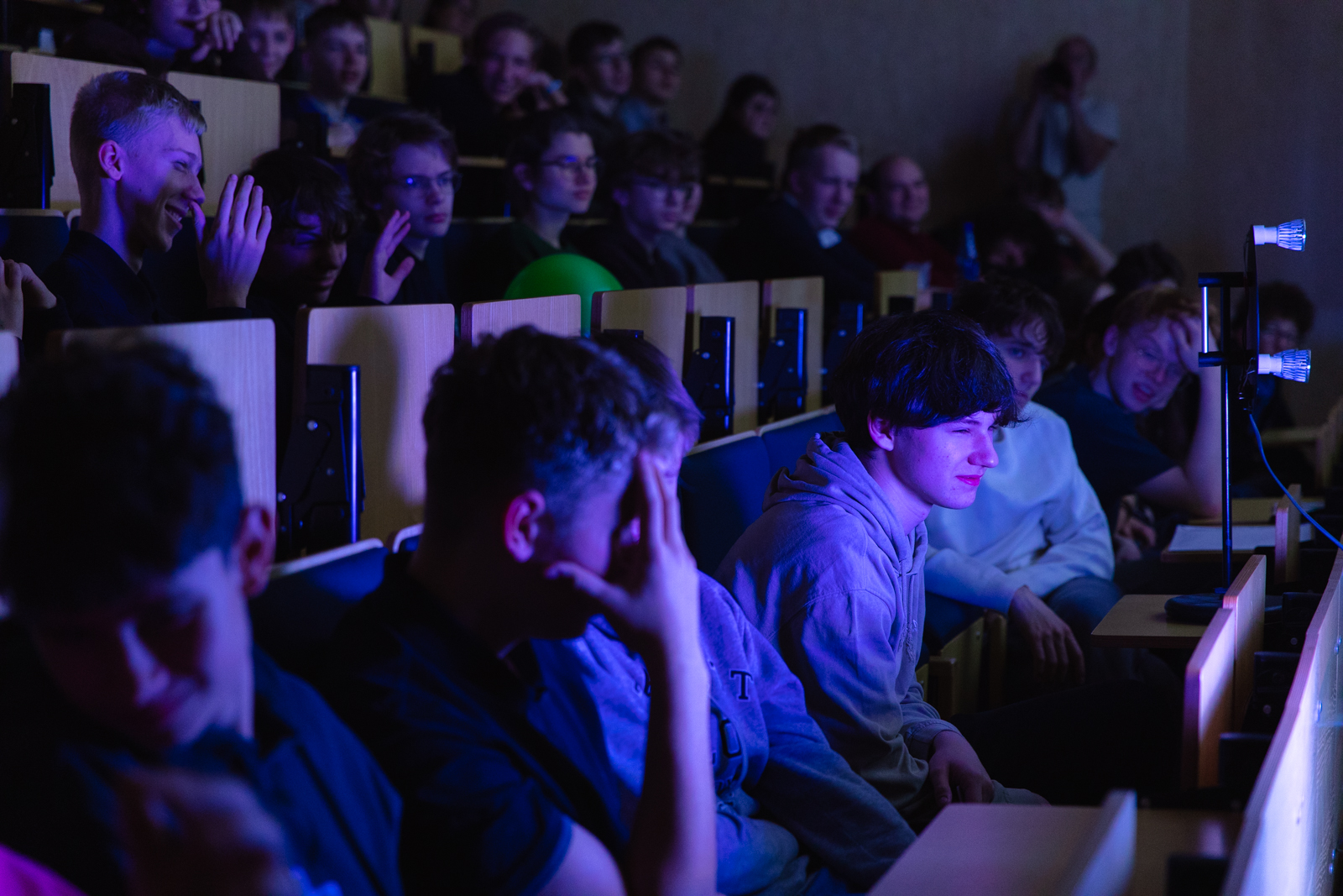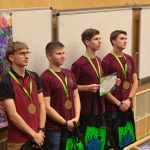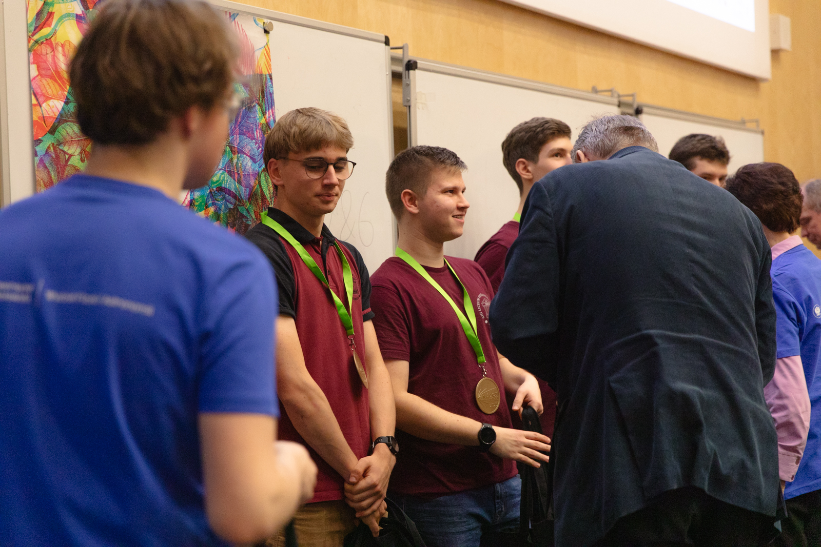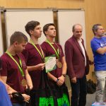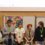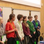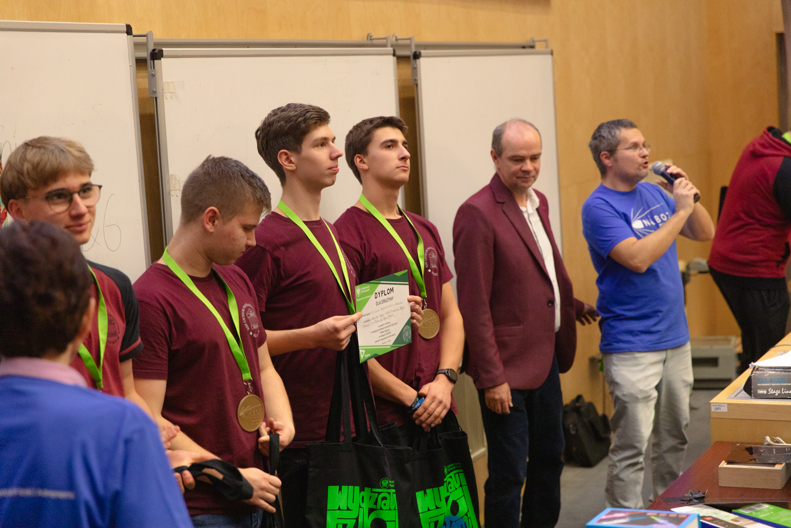 grupa pięciu chłopców z medalami na szyjach pokazuje gesty palcami do kamery, obok stoi mężczyzna z mikrofonem, całość dzieje się na sali wykładowej