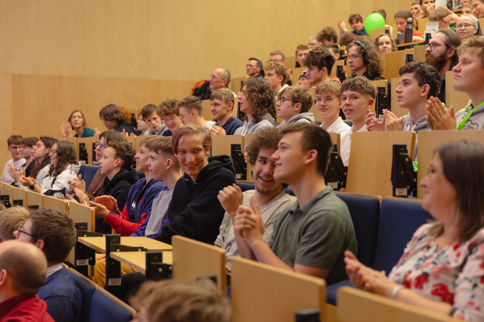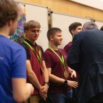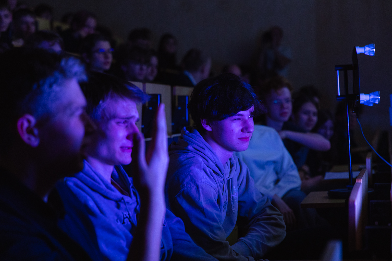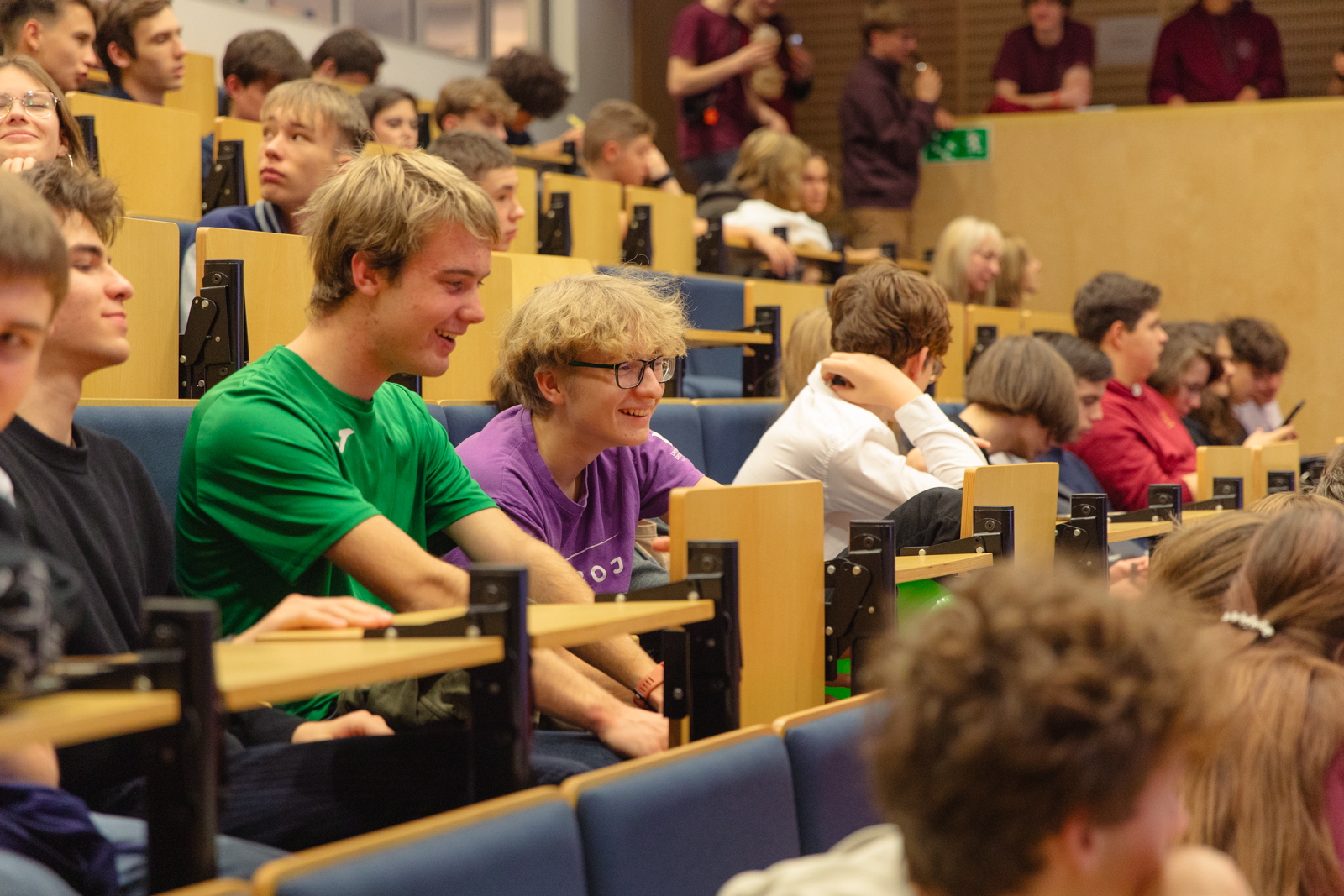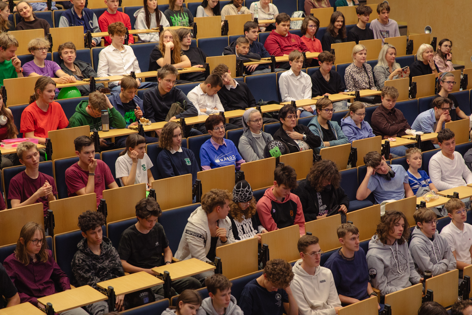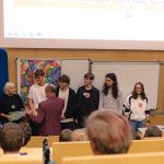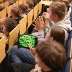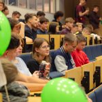 grupa pięciu chłopców z medalami na szyjach pokazuje gesty palcami do kamery, obok stoi mężczyzna z mikrofonem, całość dzieje się na sali wykładowej