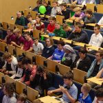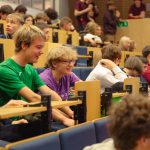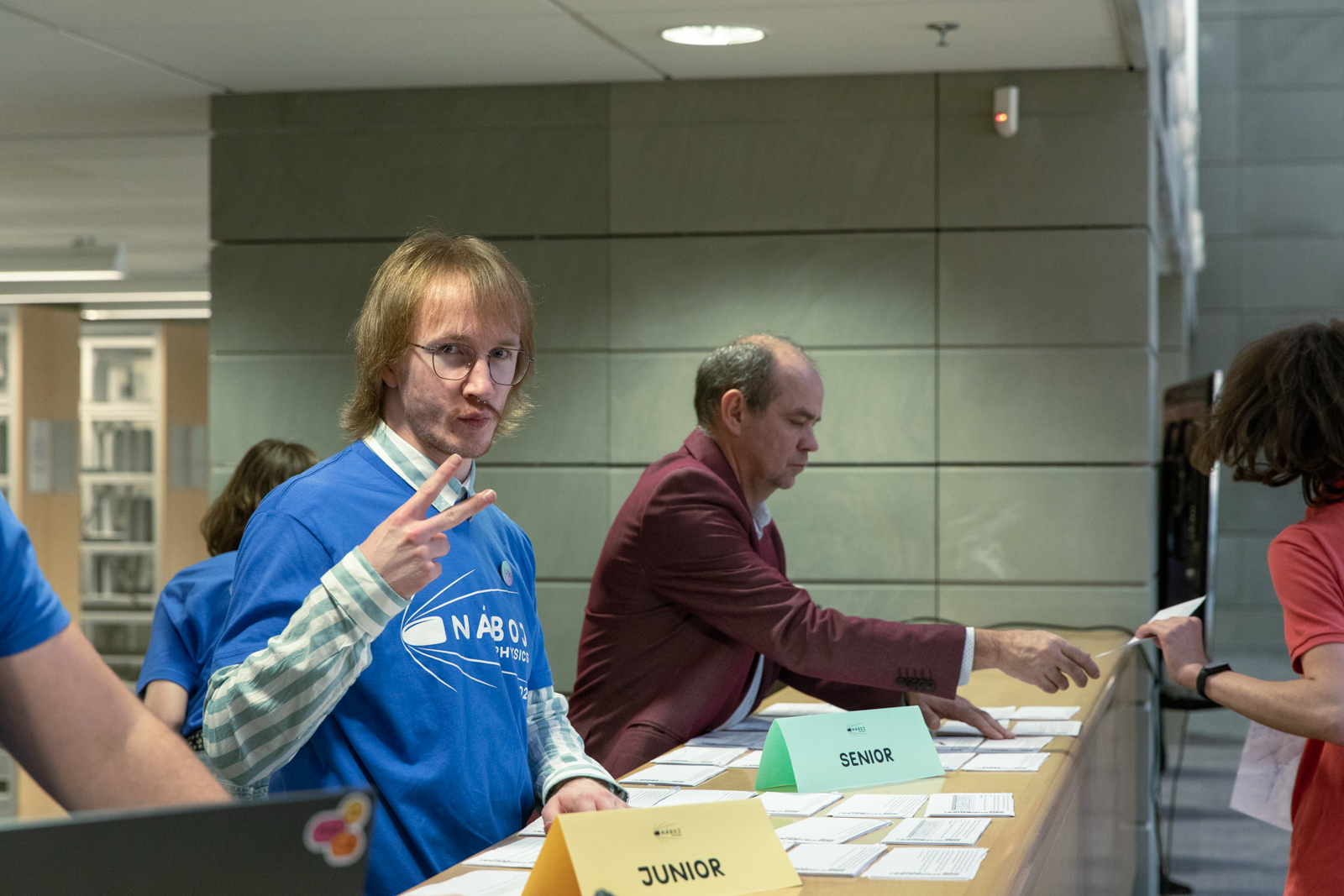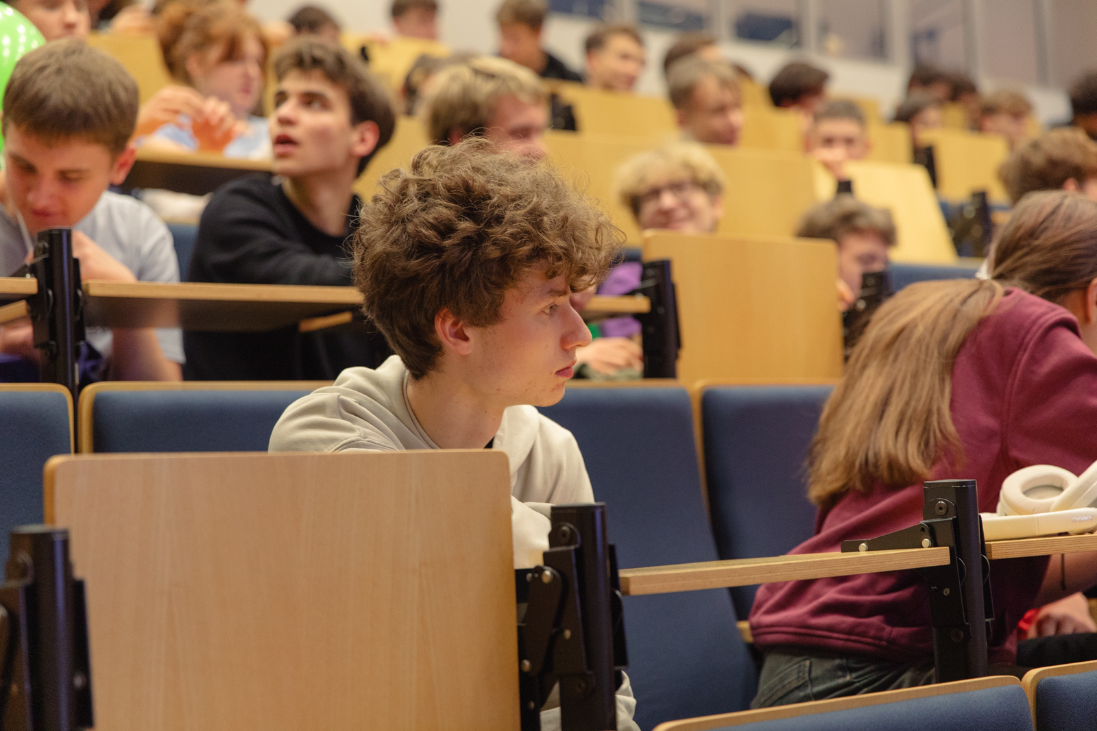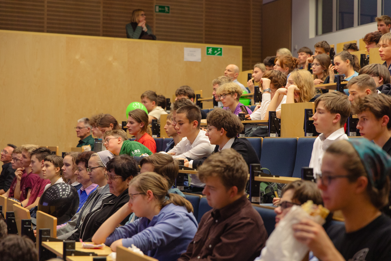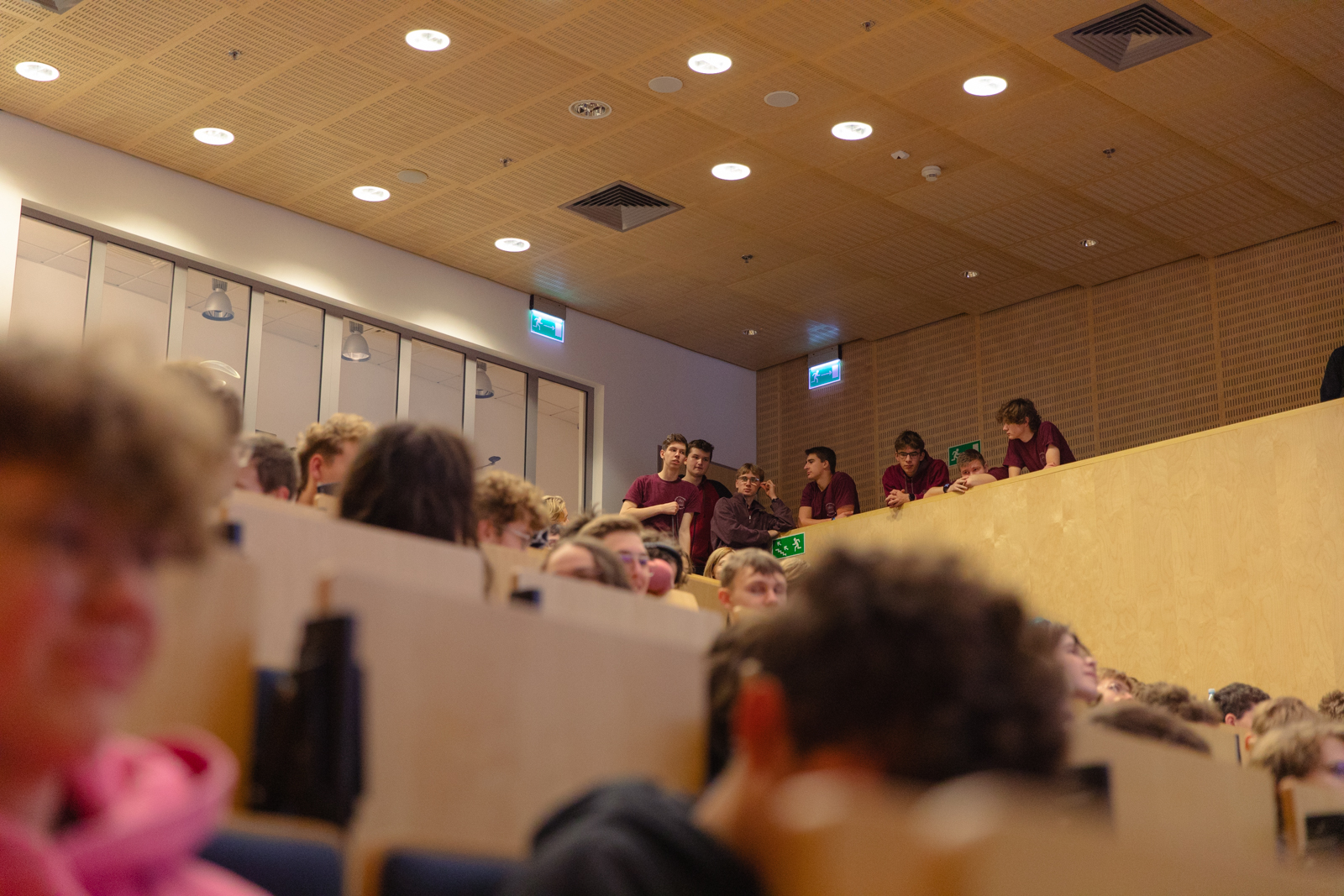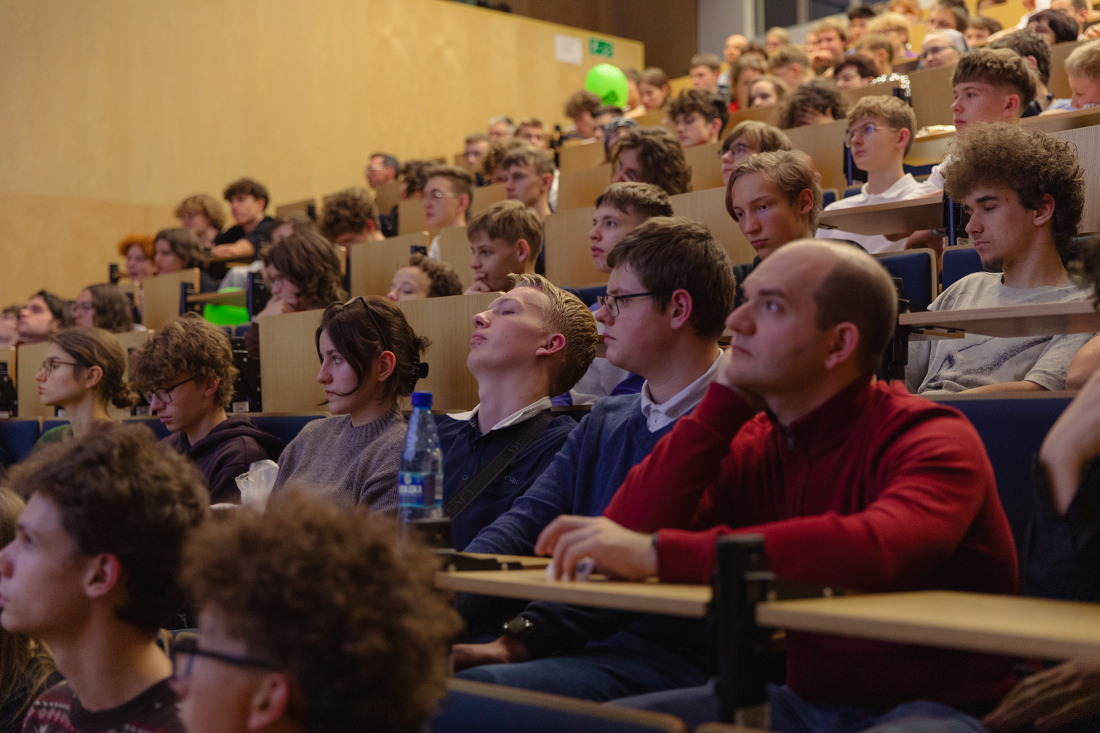 grupa pięciu chłopców z medalami na szyjach pokazuje gesty palcami do kamery, obok stoi mężczyzna z mikrofonem, całość dzieje się na sali wykładowej