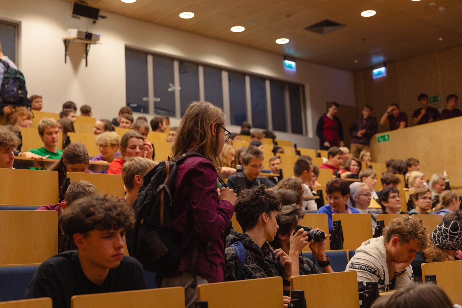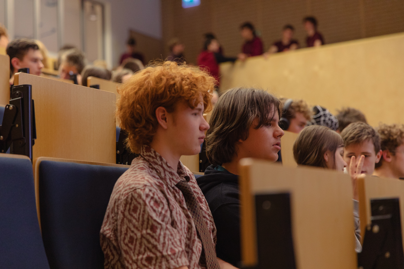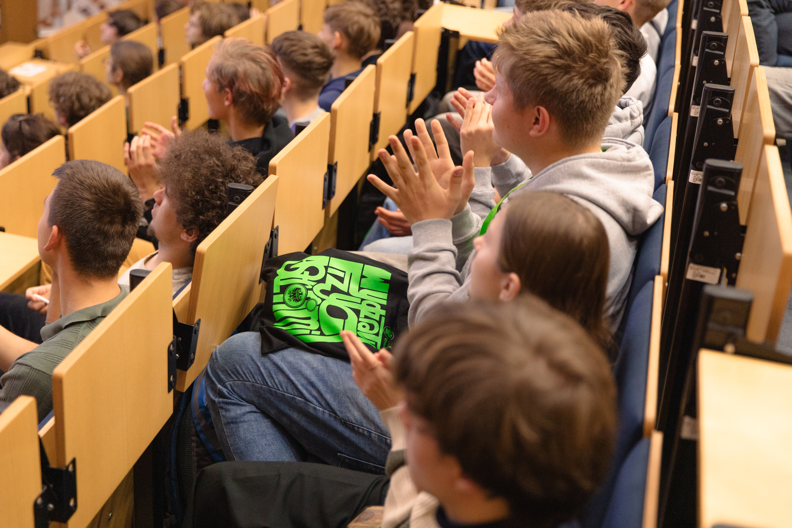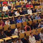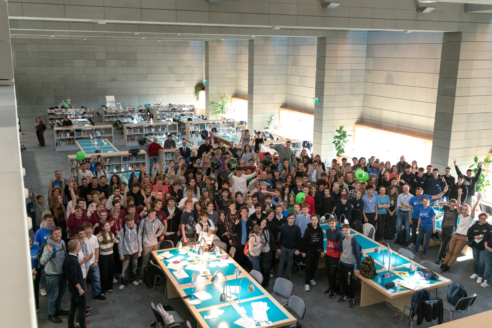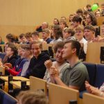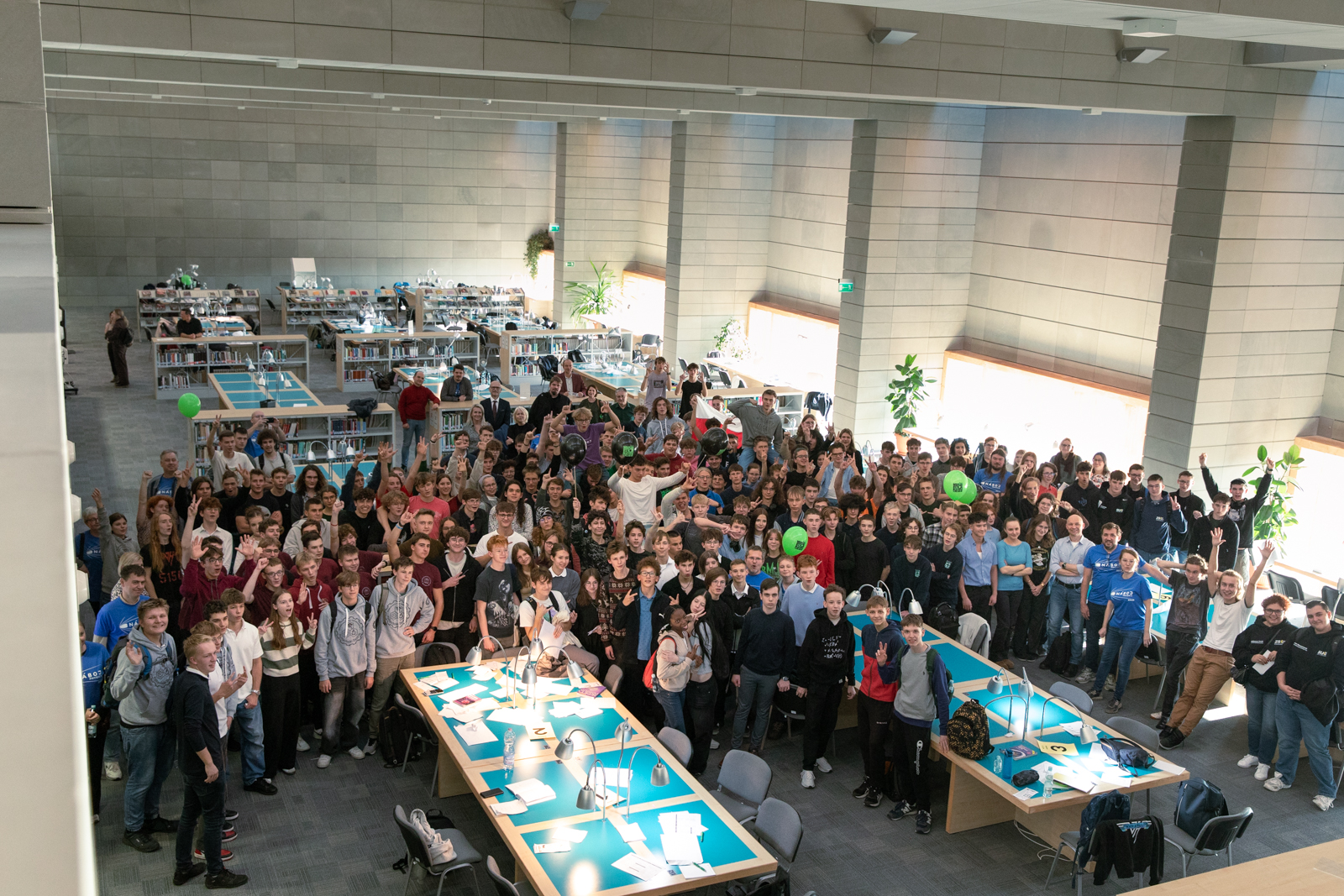 grupa pięciu chłopców z medalami na szyjach pokazuje gesty palcami do kamery, obok stoi mężczyzna z mikrofonem, całość dzieje się na sali wykładowej