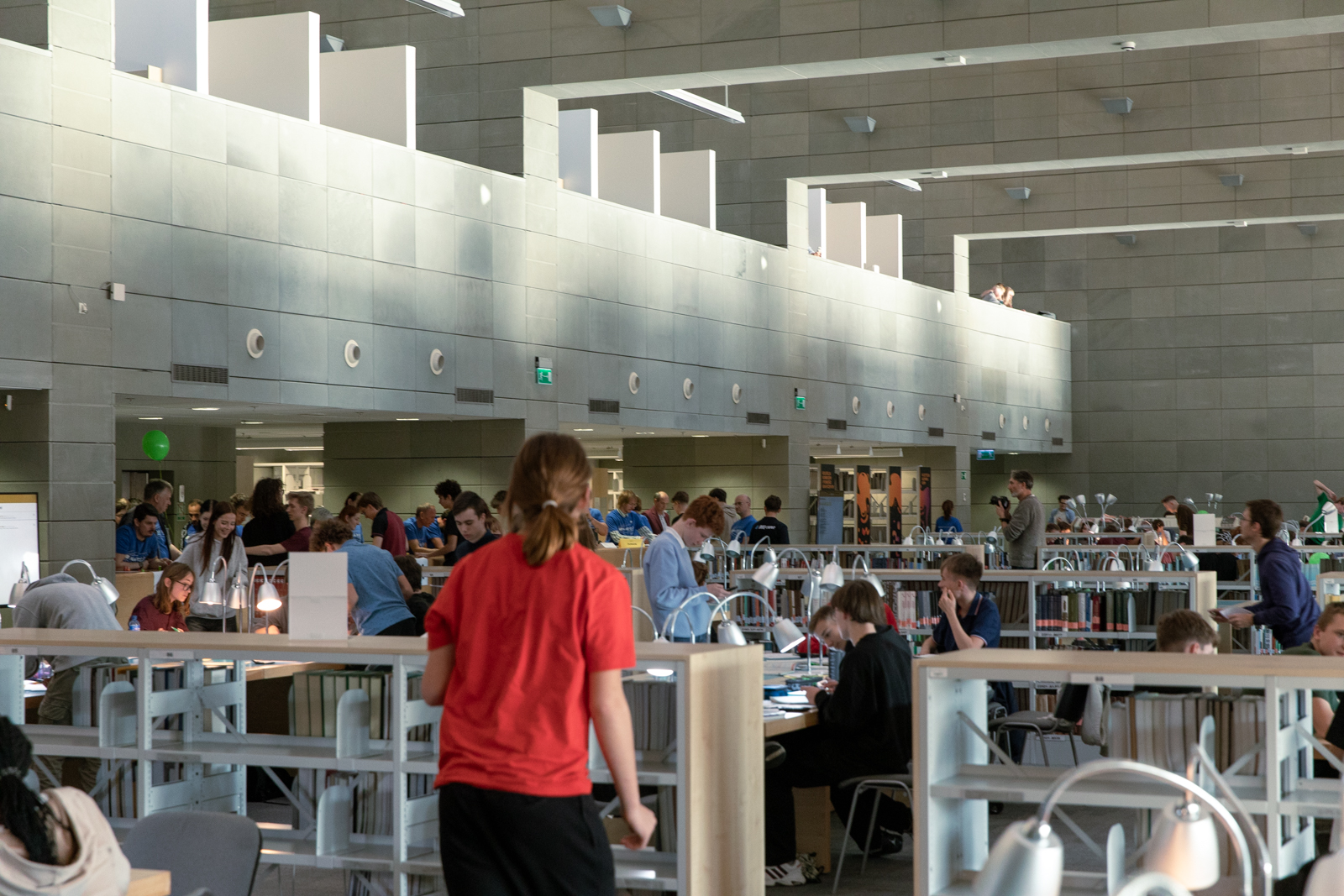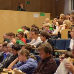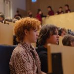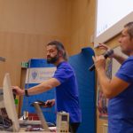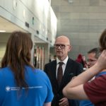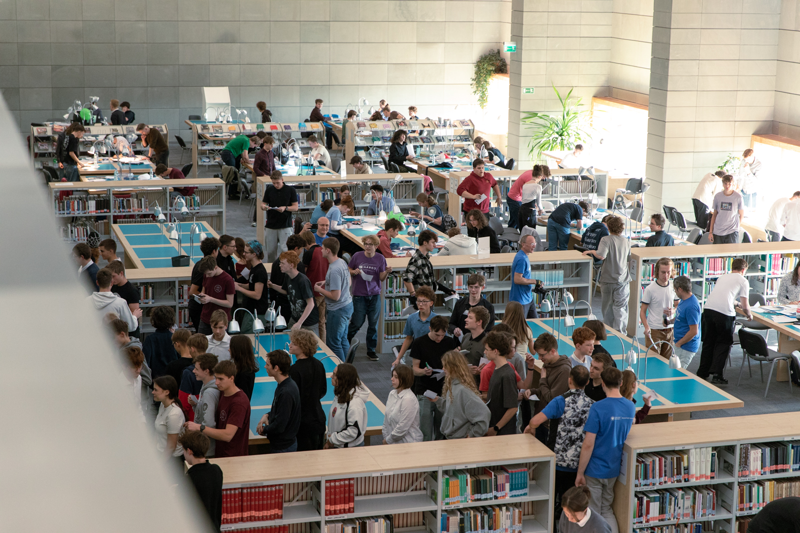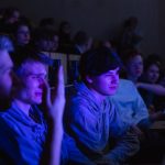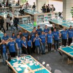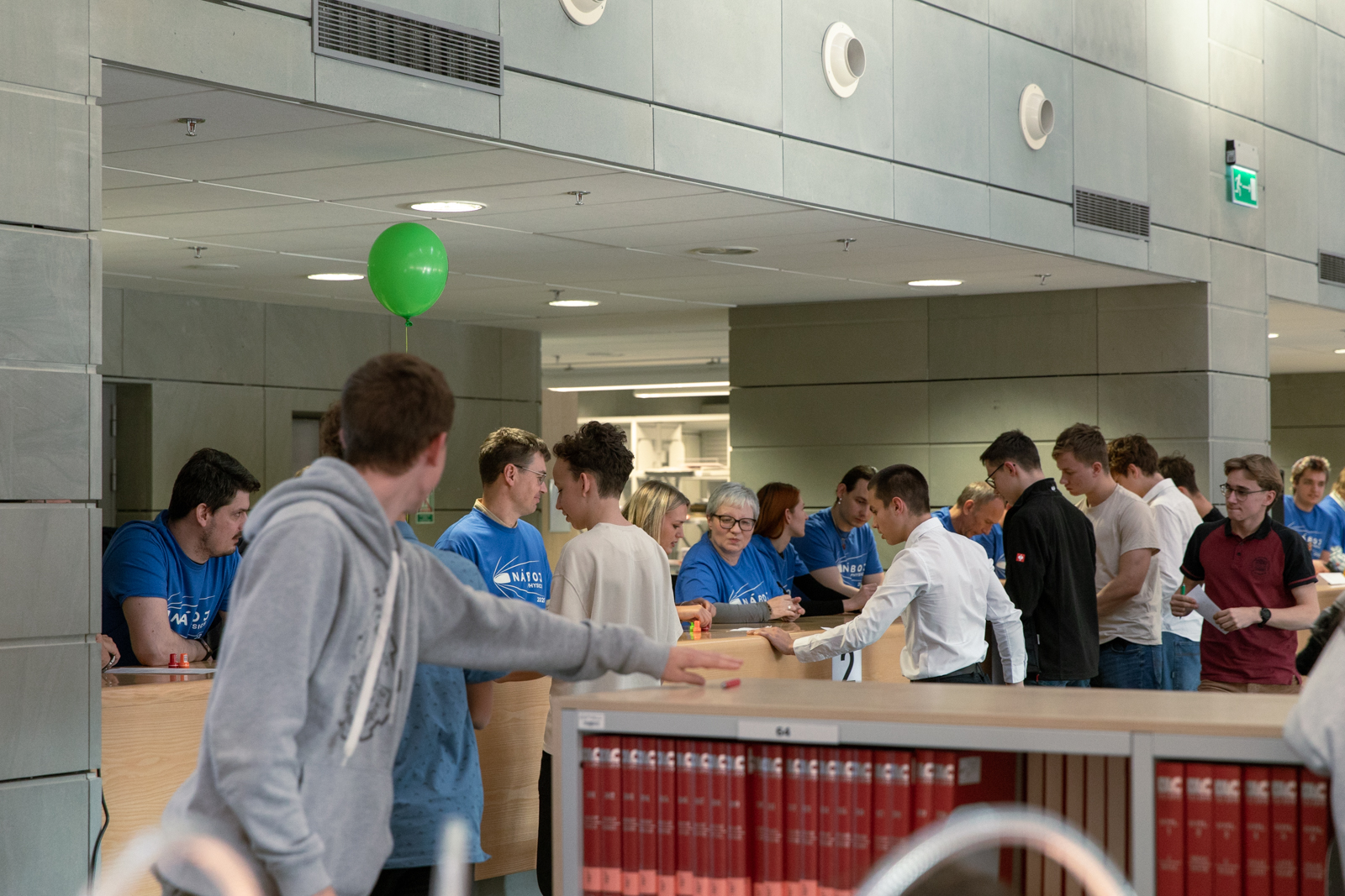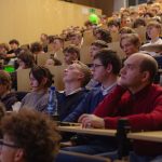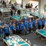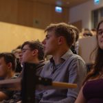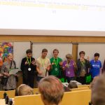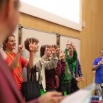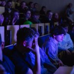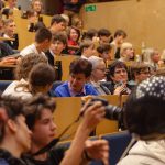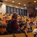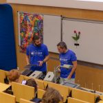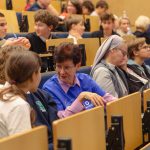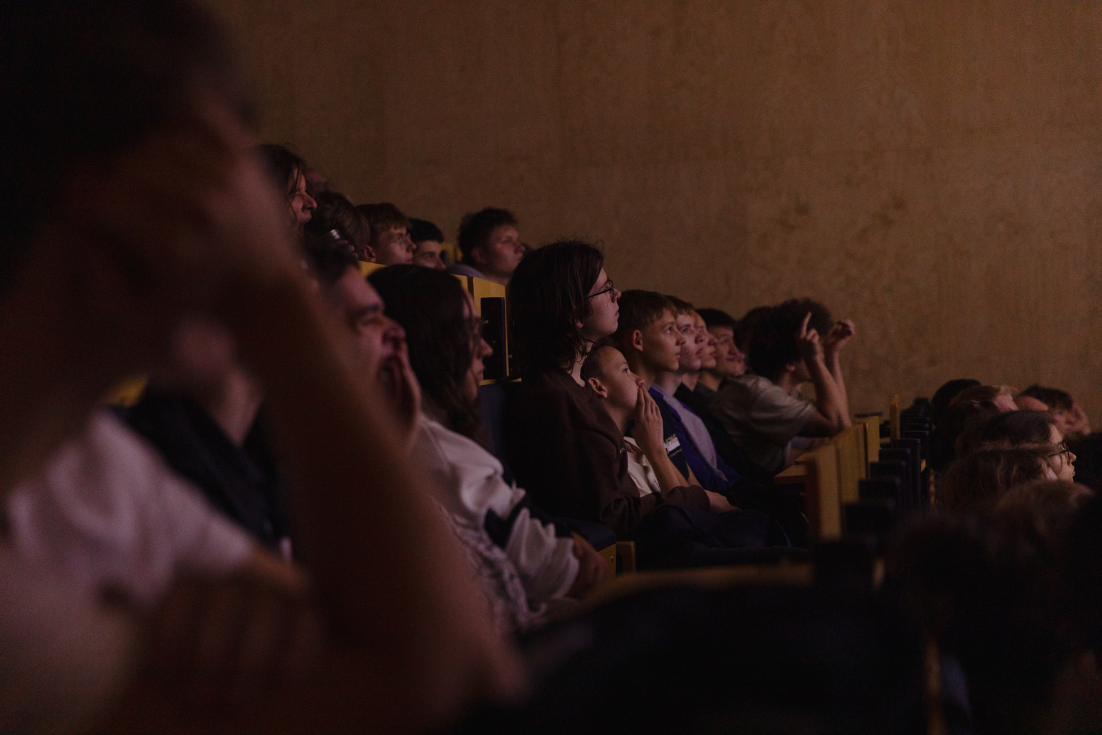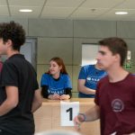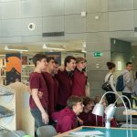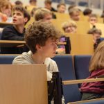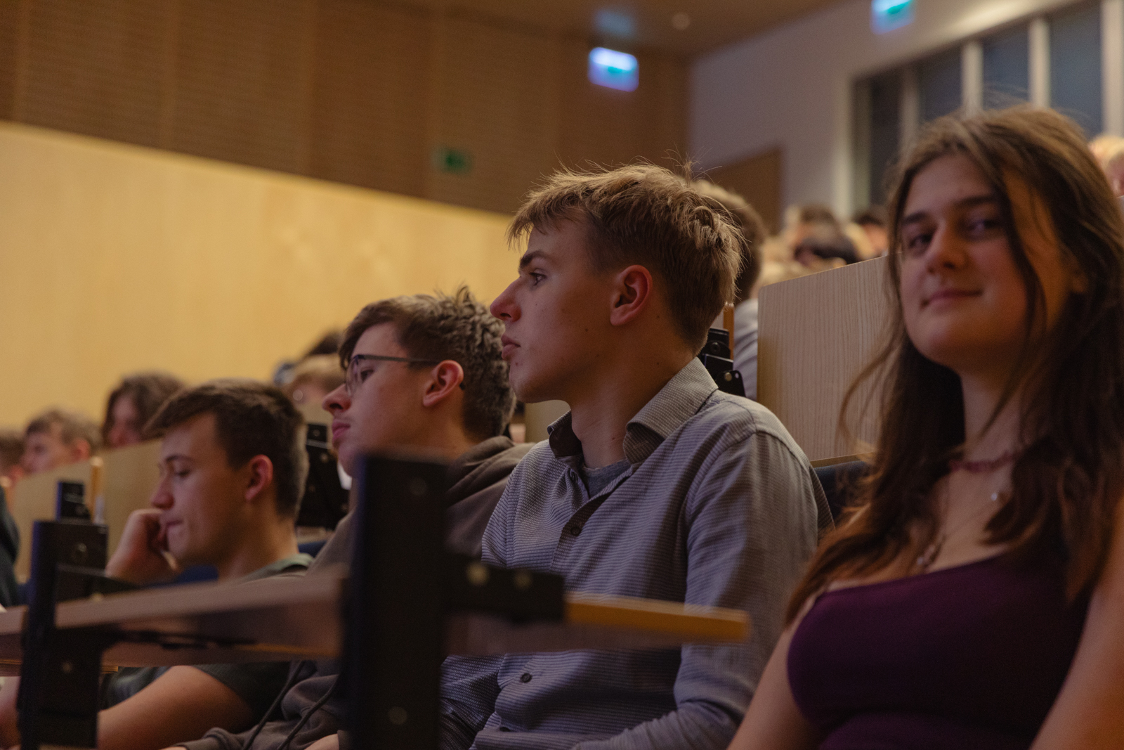 grupa pięciu chłopców z medalami na szyjach pokazuje gesty palcami do kamery, obok stoi mężczyzna z mikrofonem, całość dzieje się na sali wykładowej
