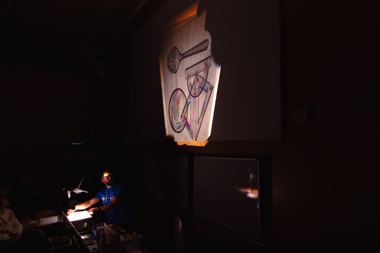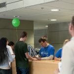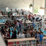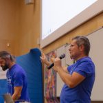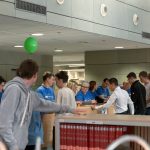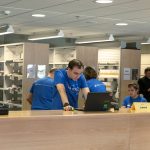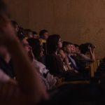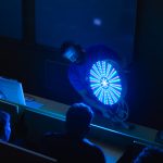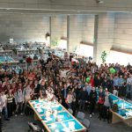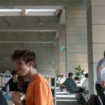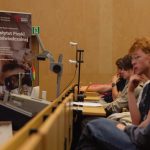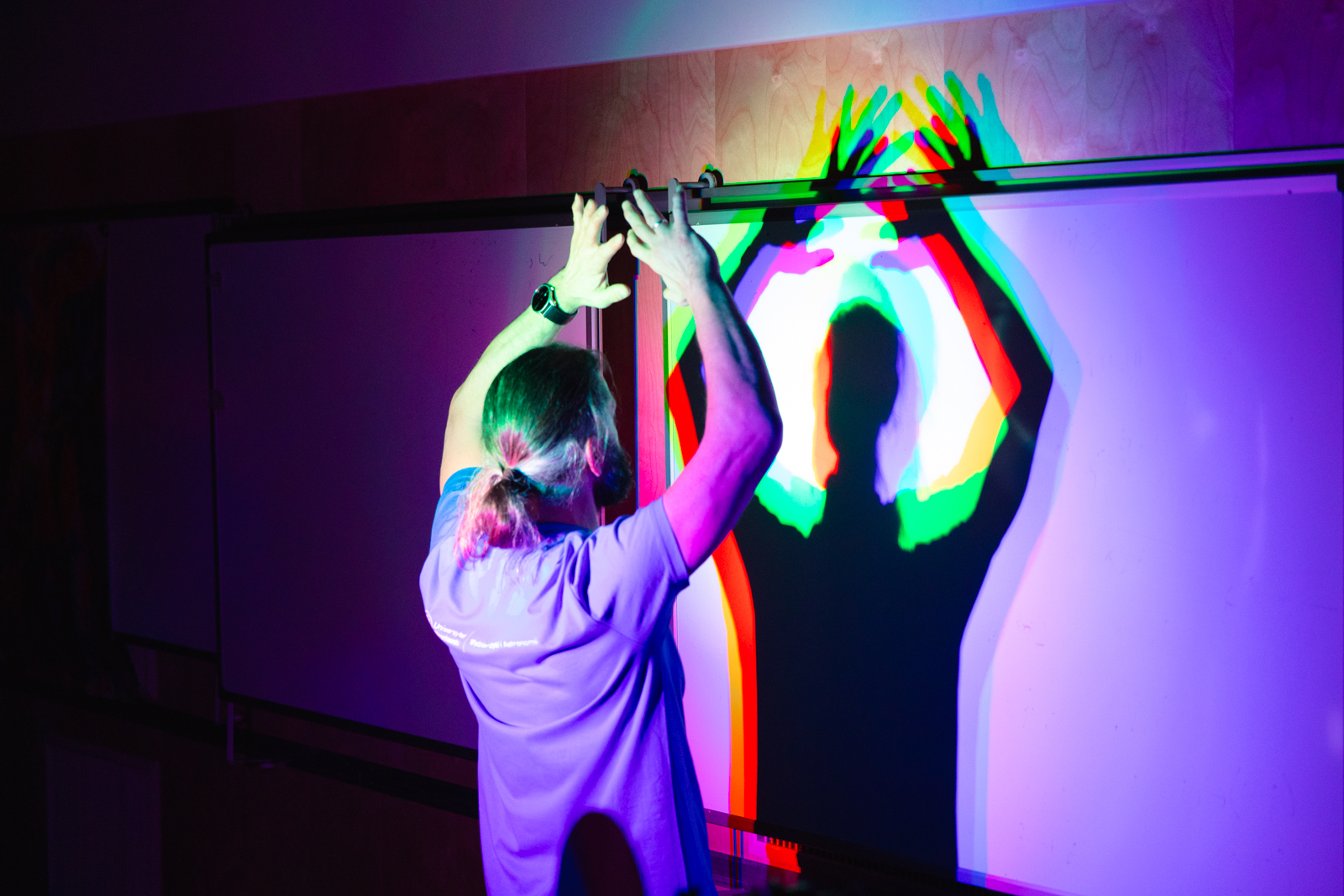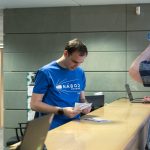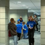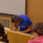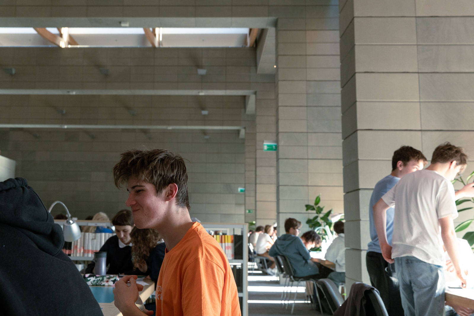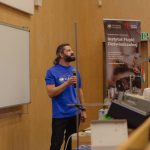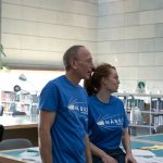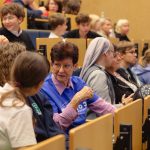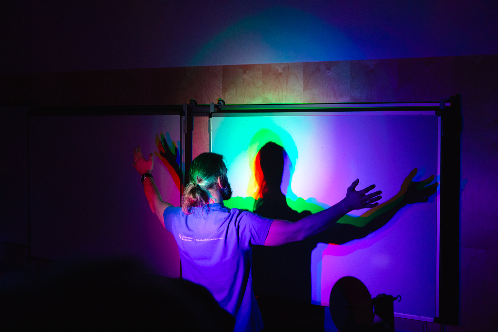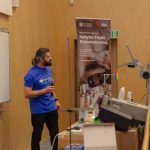grupa pięciu chłopców z medalami na szyjach pokazuje gesty palcami do kamery, obok stoi mężczyzna z mikrofonem, całość dzieje się na sali wykładowej
